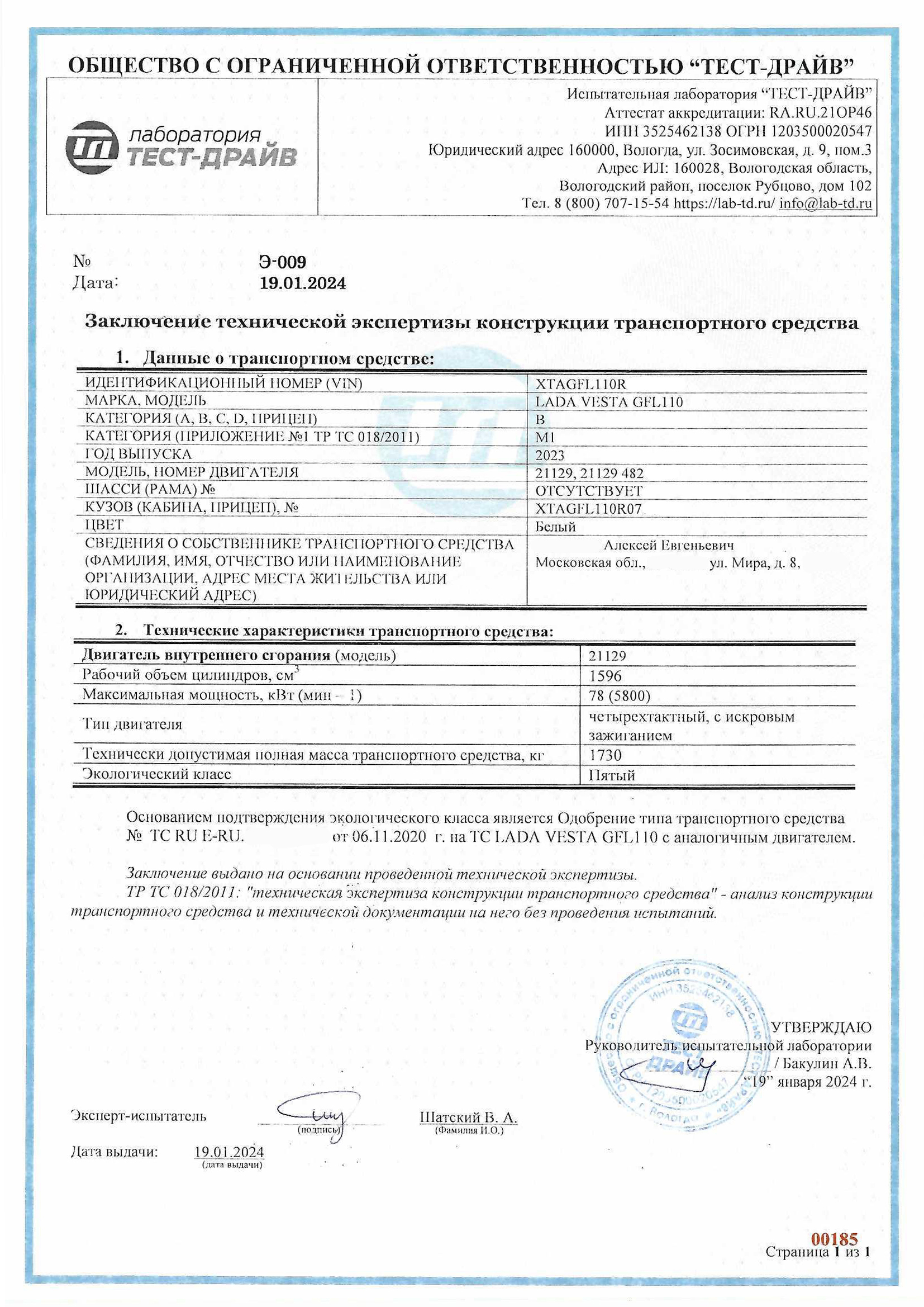 Заключение об эко классе двигателя ТС подтверждает, что ТС, а также установленный на нем двигатель, соответствуют определенному эко классу безопасности. Данный документ уполномочены выдавать только аккредитованные лаборатории.